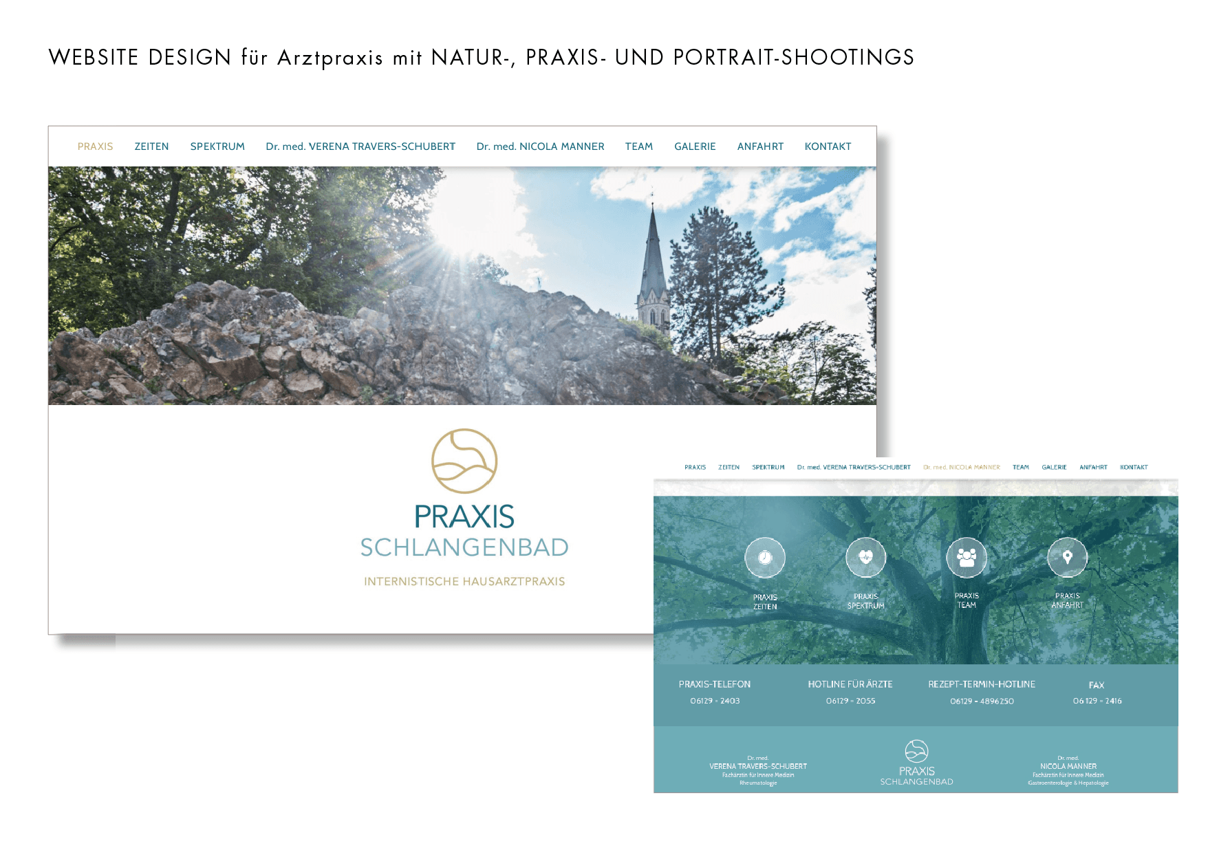 Logo-Design, Geschäftsausstattung, Website Design, Porträtshootings von Ärztinnen und Mitarbeiterinnen, Location-Shooting von Praxisräumen sowie einem Naturshooting für das Bildkonzept.